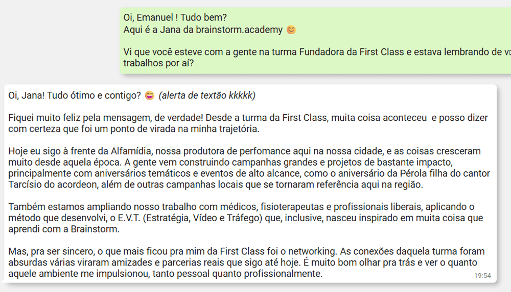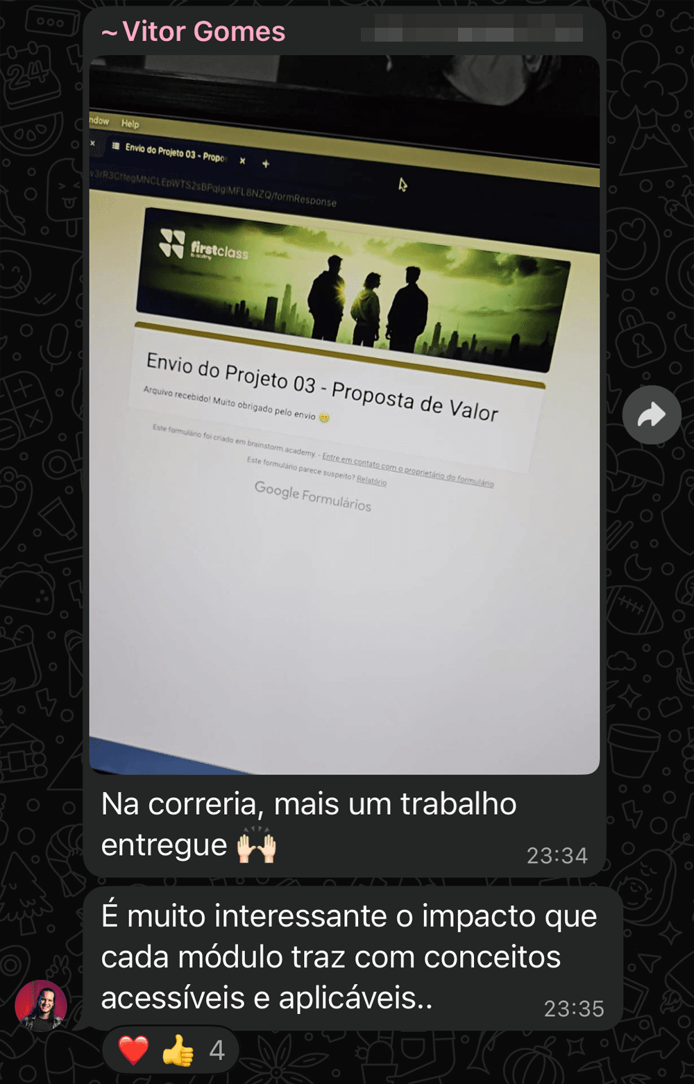 Um dos maiores tesouros da First Class é a relação com os colegas de turma e o networking gerado ao longo das aulas, fazendo com que a evolução em grupo seja muito mais preciosa do que uma conquista individual.